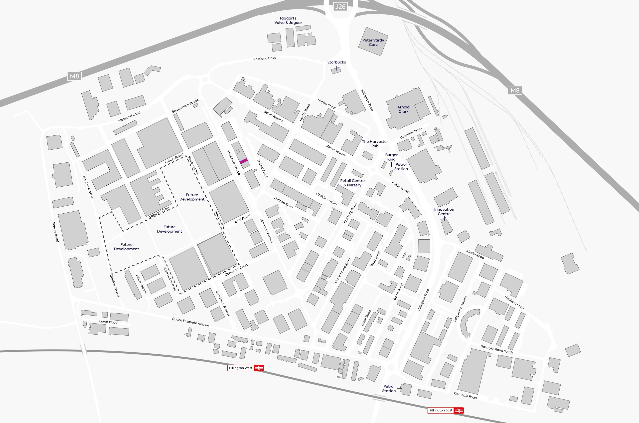 Hillington Park is home to over 500 businesses and a workforce of over 8,000 people. The Estate is situated at J26 of the M8, has 2 train stations and numerous bus services. There is a wide variety of food and amenities with 24/7 cctv security on site.