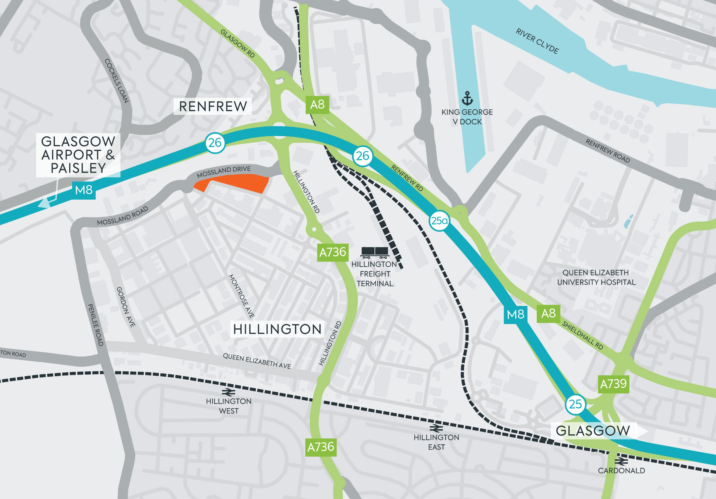 Positioned to the west of Glasgow City Centre, less than half a mile from J26 of the M8 motorway, the site gives fast access to the M74 and M77 and offers superb, rail, air and sea connections.