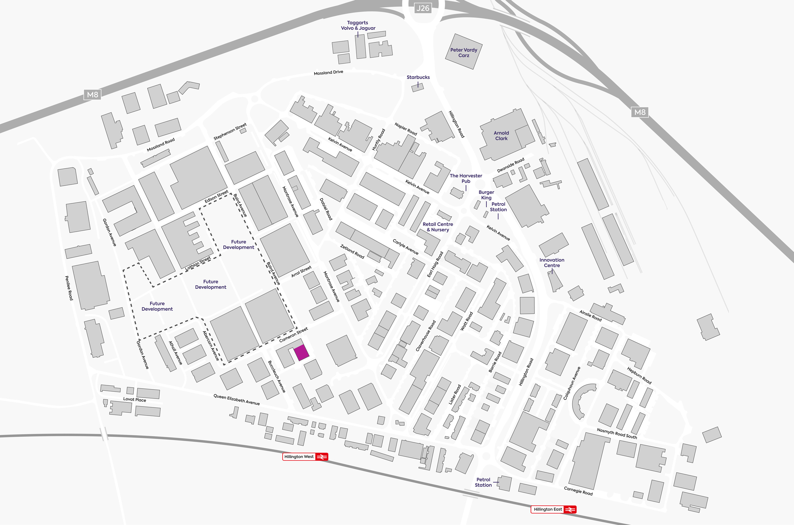 Hillington Park is home to over 500 businesses and a workforce of over 8,000 people. The Estate is situated at J26 of the M8, has 2 train stations and numerous bus services. There is a wide variety of food and amenities with 24/7 cctv security on site.